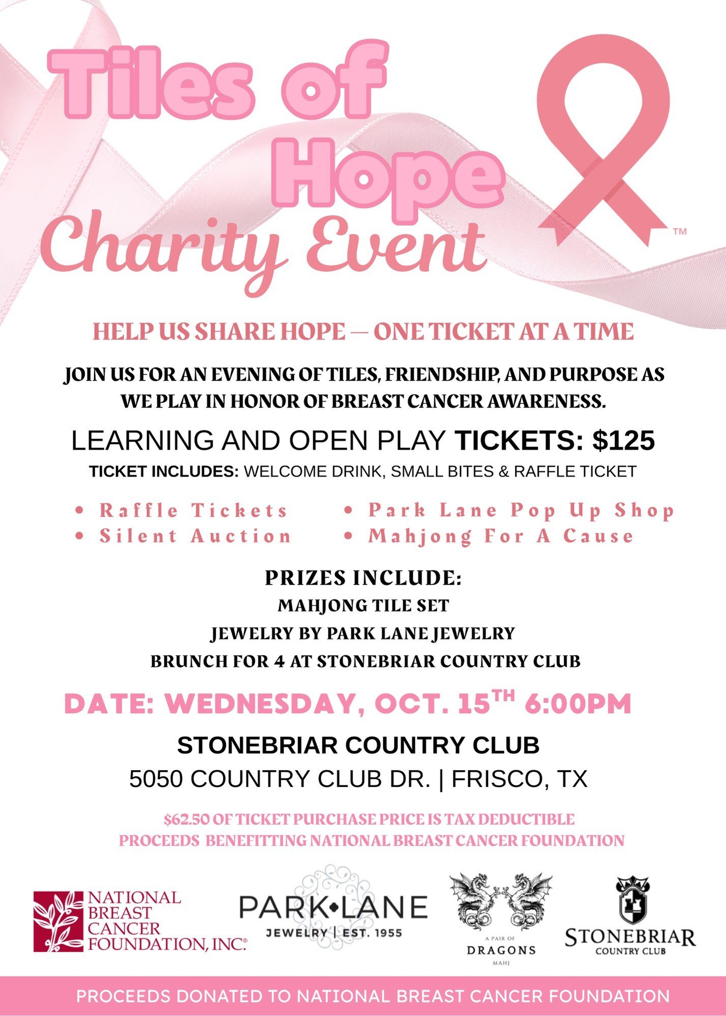 Every ticket purchased helps fund programs that provide hope and support to those impacted by breast cancer. Together, we can make a difference—one tile, one sip, and one smile at a time.